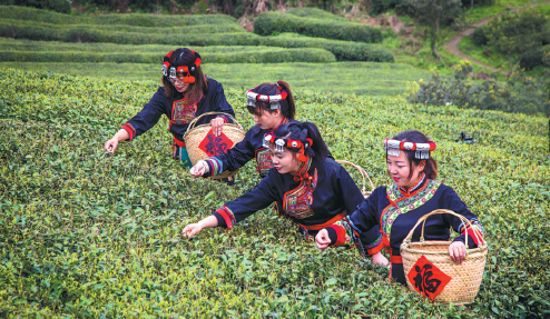 ▲ Workers pick tea leaves during a ceremony to mark the first harvest of the year, which occurs each spring, in Ningde, Fujian province, in March 2022. YANG ENA/FOR CHINA DAILY