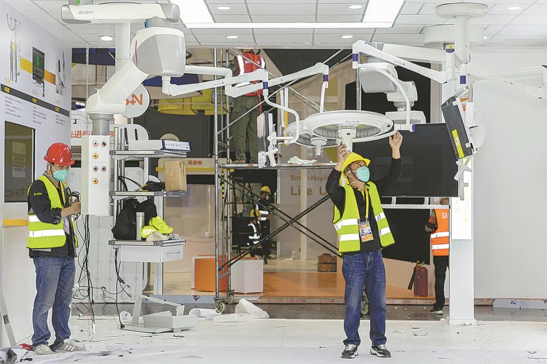 ▲ Workers set up an exhibition booth on Monday at the National Exhibition and Convention Center in Shanghai, the main venue for the upcoming fifth China International Import Expo. Photo/Xinhua