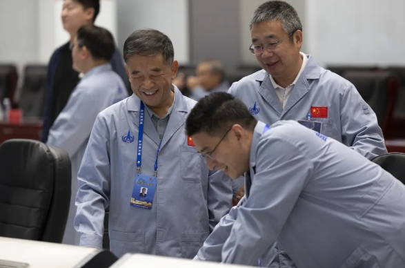 ▲Hu Hao (left), chief designer of the Chang'e 6 mission, Li Dong (center), chief designer of the Long March 5 carrier rocket, and Wang Qiong, deputy chief designer of the mission, discuss the progress of the mission. JIN LIWANG/XINHUA/CHINA DAILY