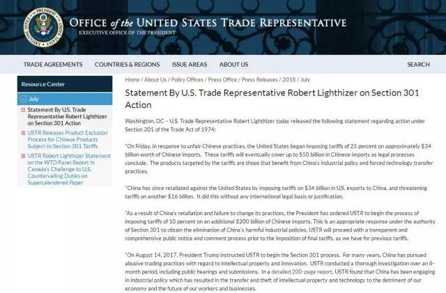 “On August 14, 2017, President Trump instructed USTR to begin the Section 301 process. For many years, China has pursued abusive trading practices with regard to intellectual property and innovation. USTR conducted a thorough investigation over an 8-month period, including public hearings and submissions. In a detailed 200-page report, USTR found that China has been engaging in industrial policy which has resulted in the transfer and theft of intellectual property and technology to the detriment of our economy and the future of our workers and businesses.