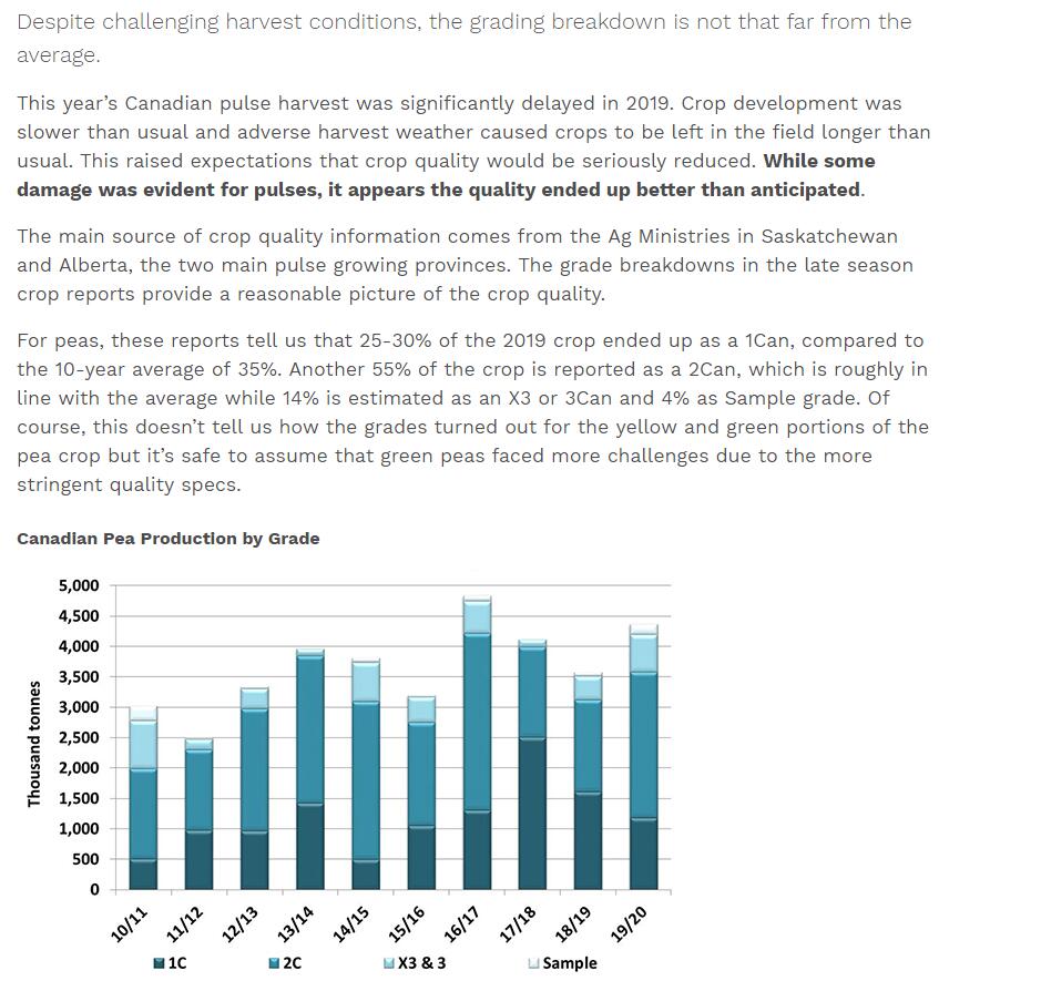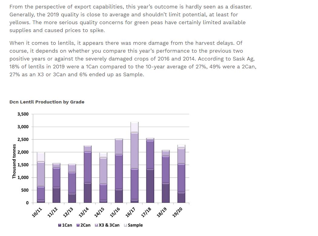 Just like for peas, the overall grade profile obscures the greater impact on green lentils, due to more stringent requirements for colour. This is a key reason why green lentil prices have shown a larger response this fall. In general, while the lower quality of the 2019 lentil crop adds some challenges to the flow of exports, the issues aren’t large enough to severely restrict export flows, especially for red lentils.
